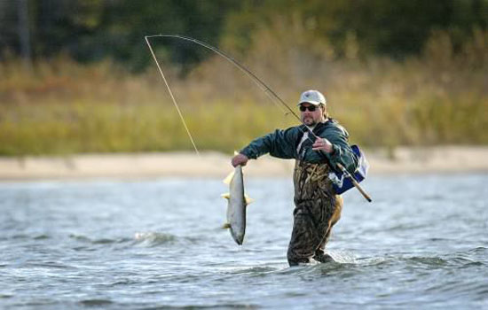 The Fishing Season from April to October. Only artificial flies are allowed and each licence entitles the angler to keep six fish a day, none being shorter than 7.5 cm. Beats may be reserved for a day or a week at a time in one of the three basic types of streams. Larger rivers like Sindh or Liddar are full with snow, melting from May to July, with an occasional pool under boulders. Spinning is allowed here, but the wet fly and weighted cast tests the skill of the angler and will produce good results. In April, August and September these rivers are quieter, and the bigger fish are said to lie in the stiller waters. Tributaries and water channels near these mainstream beats provide another type of fishing throughout the season. These are the smaller streams where only flies are allowed, with wet fly fishing good all season. The third type are the small spring fed streams and high altitude lakes suitable for both dry and wet fly tackle. Equipments A light two to three metre Rod (fishing rods cannot be carried as hand luggage on aircraft for security reasons) with an eight cm reel will suffice. Common flies in use in Kashmir include Peacock, March Brown, Butcher, Jinger Quill, Coachman, Woodcock & Green and Watson's Fancy.